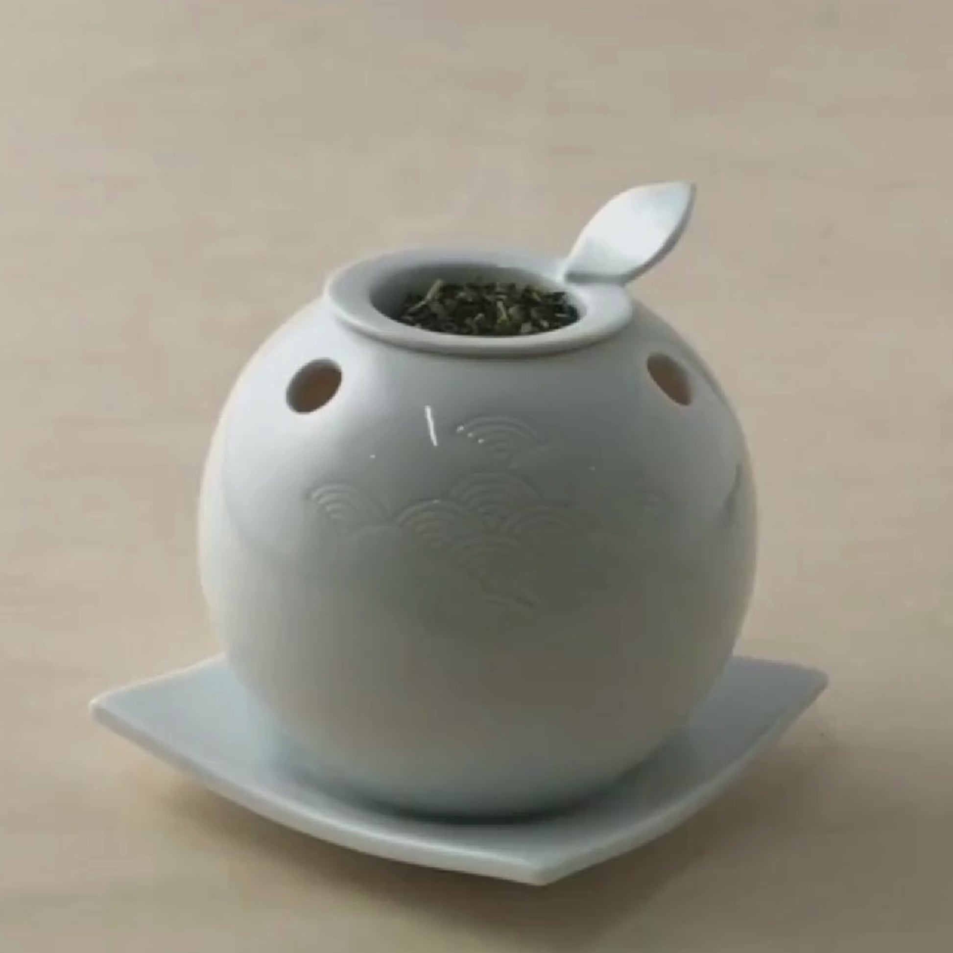 Let the serene aroma of your favorite tea drift through the home with this unique aroma diffuser, designed specifically for roasting tea leaves. Simply place your chosen leaves on the top plate of the Chakoro - meaning “tea incense burner” in Japanese - and light a tea candle inside the porcelain dome. As the gentle heat releases the tea’s fragrance, the hand-carved wave motif comes to life, illuminated from within.